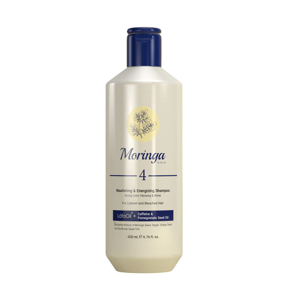 شامپو مغذی و انرژی بخش ۴ مورینگا امو مناسب موهای رنگ و دکلره شده با بهرهمندی از ترکیبات موثری همچون روغن لافا، کافئین و روغن هسته انار از موی رنگ شده در برابر کاهش کیفیت رنگ مو، آسیب و ریزش محافظت مینماید.